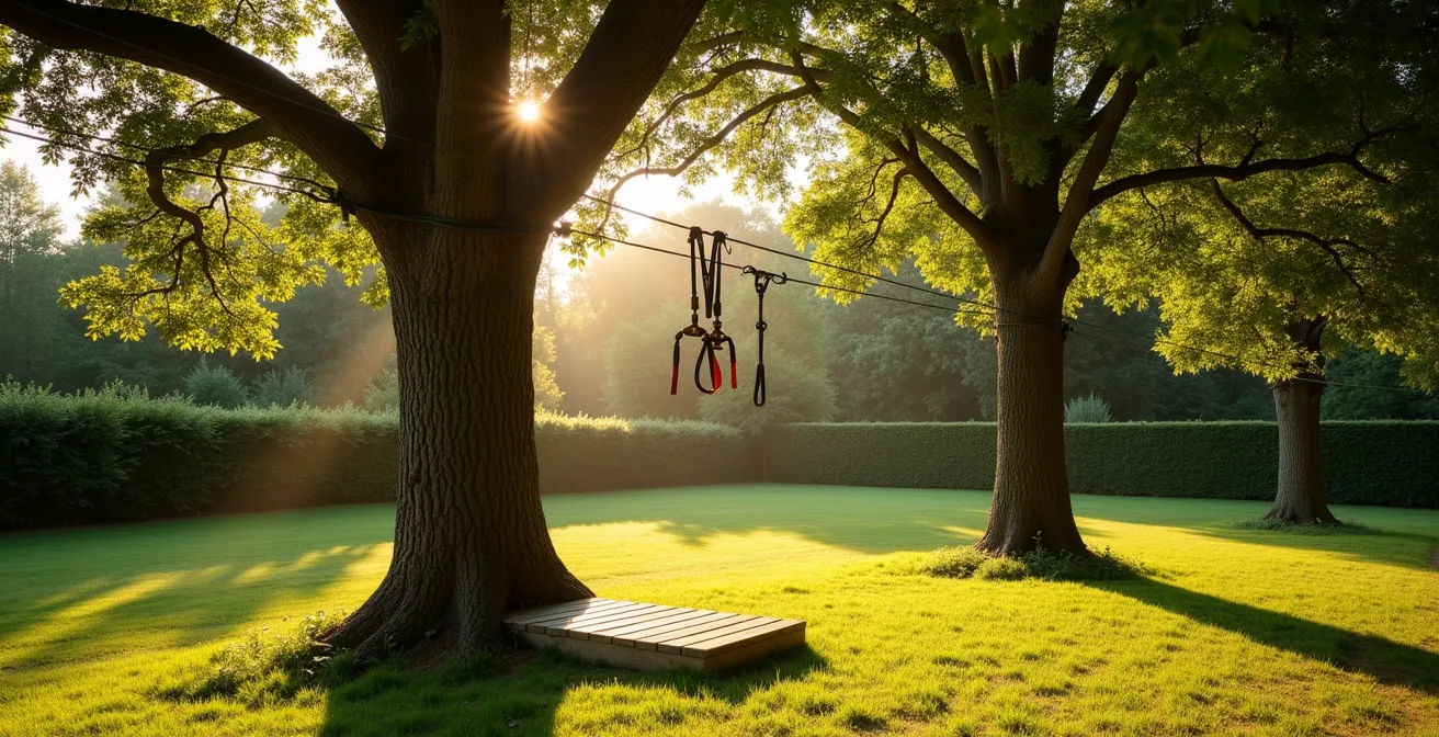 Cette installation devient le théâtre de défis personnels et de victoires partagées. En fournissant un cadre parfaitement sécurisé, vous permettez à vos enfants d’expérimenter des sensations fortes dans un environnement de confiance. Vous leur apprenez implicitement qu’avec de la préparation, de la rigueur et le respect des règles, on peut transformer un projet ambitieux en une source de pur bonheur. La tyrolienne n’est finalement pas le but ; c’est un moyen de construire la confiance, le courage et la joie.